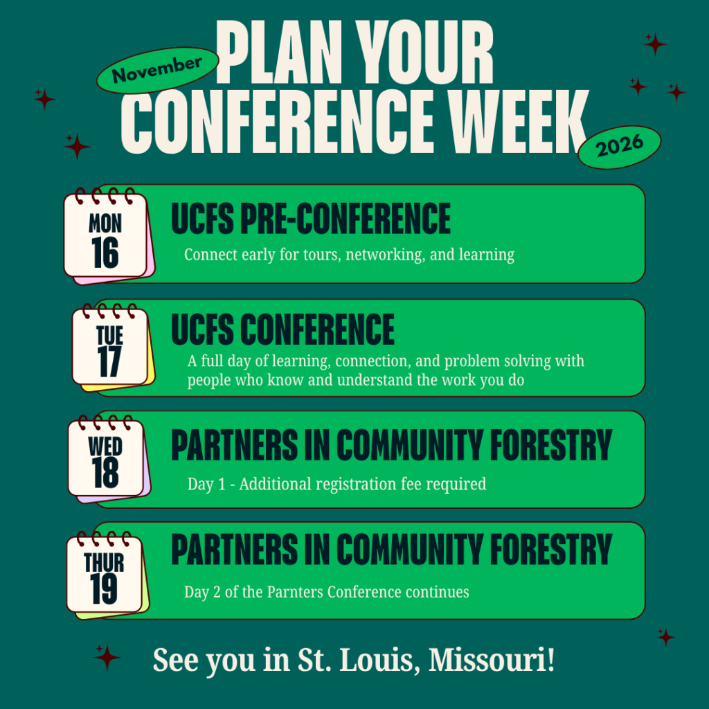 UCFS’s conference will be followed by the Partners in Community Forestry conference from November 18-19, 2026. Stay for the full week of learning!
